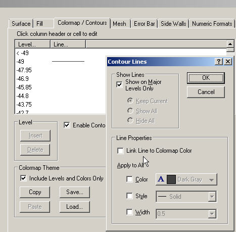 Go to Plot Details: Plot Properties: Colormap/Contours tab, click Line... column header to open Counter Lines dialog.